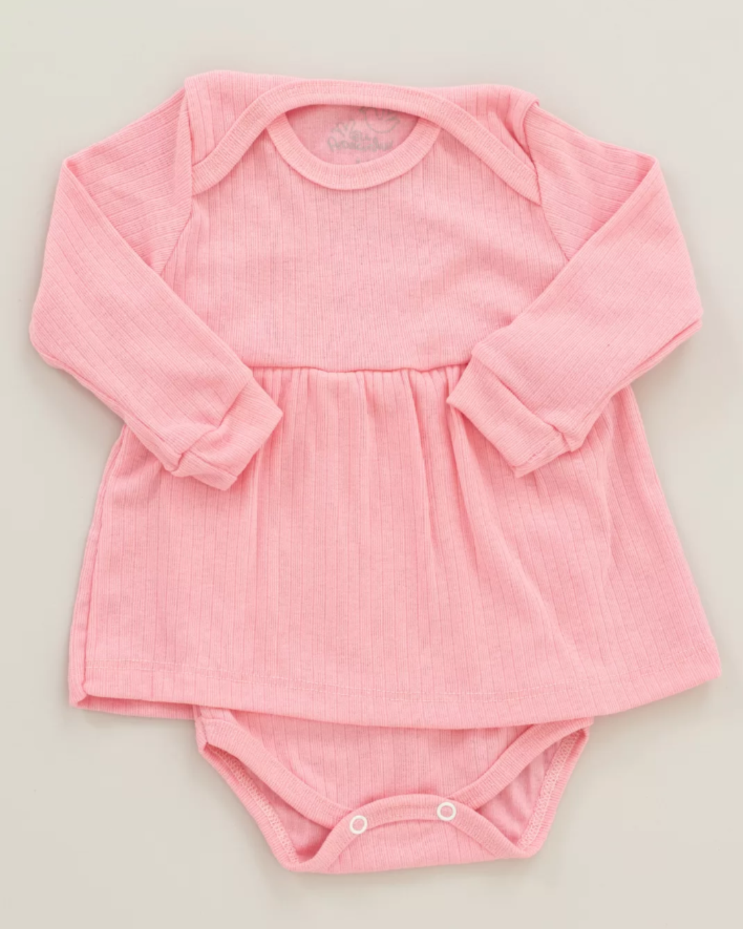 Confeccionado em canelado 100% algodão, nosso vestido é macio e respirável, ideal para a pele sensível dos bebês. O body por baixo proporciona maior segurança e conforto, além de facilitar as trocas de fralda.