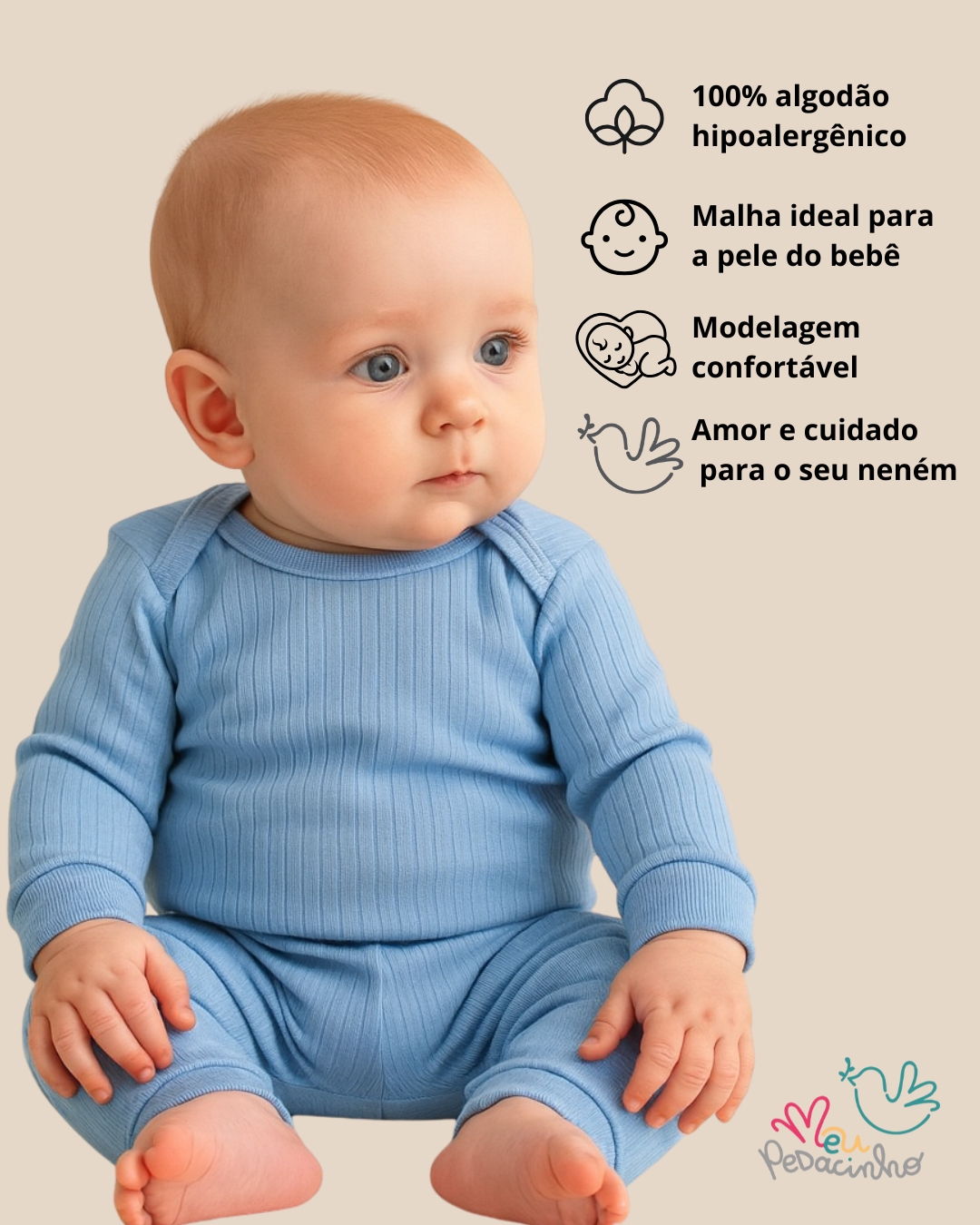 Nosso conjunto é confeccionado em malha canelada 100% algodão com a tecnologia Confort Premium, proporcionando um toque suave e delicado na pele do seu bebê. O algodão é um tecido natural que: