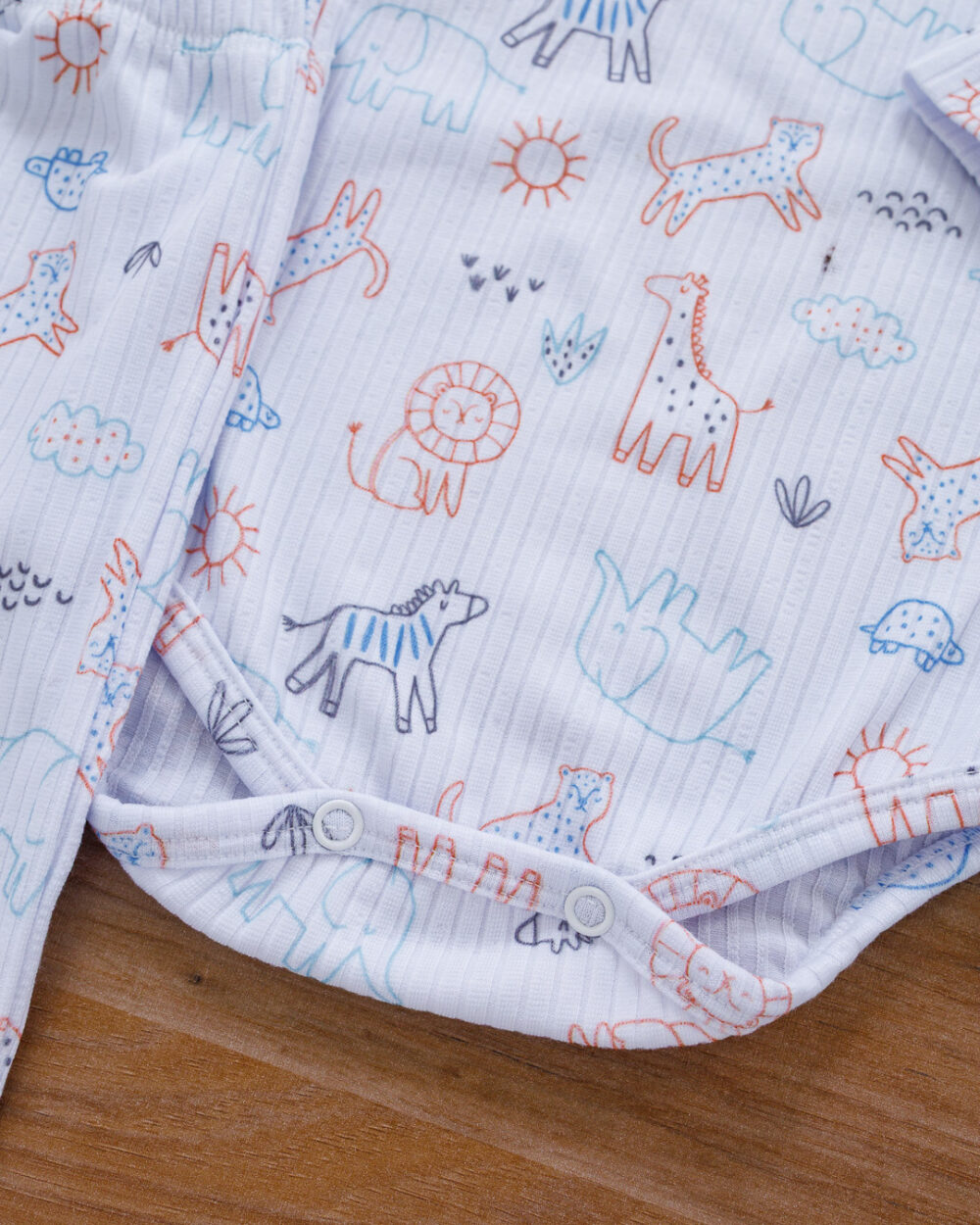 Feito com uma malha de alta qualidade, o conjunto é composto por 96% poliéster e 4% elastano. Essa combinação proporciona uma malha que estica, garantindo liberdade de movimento para o seu bebê. As estampas coloridas e delicadas são atemporais, trazendo um toque de charme e alegria ao visual.