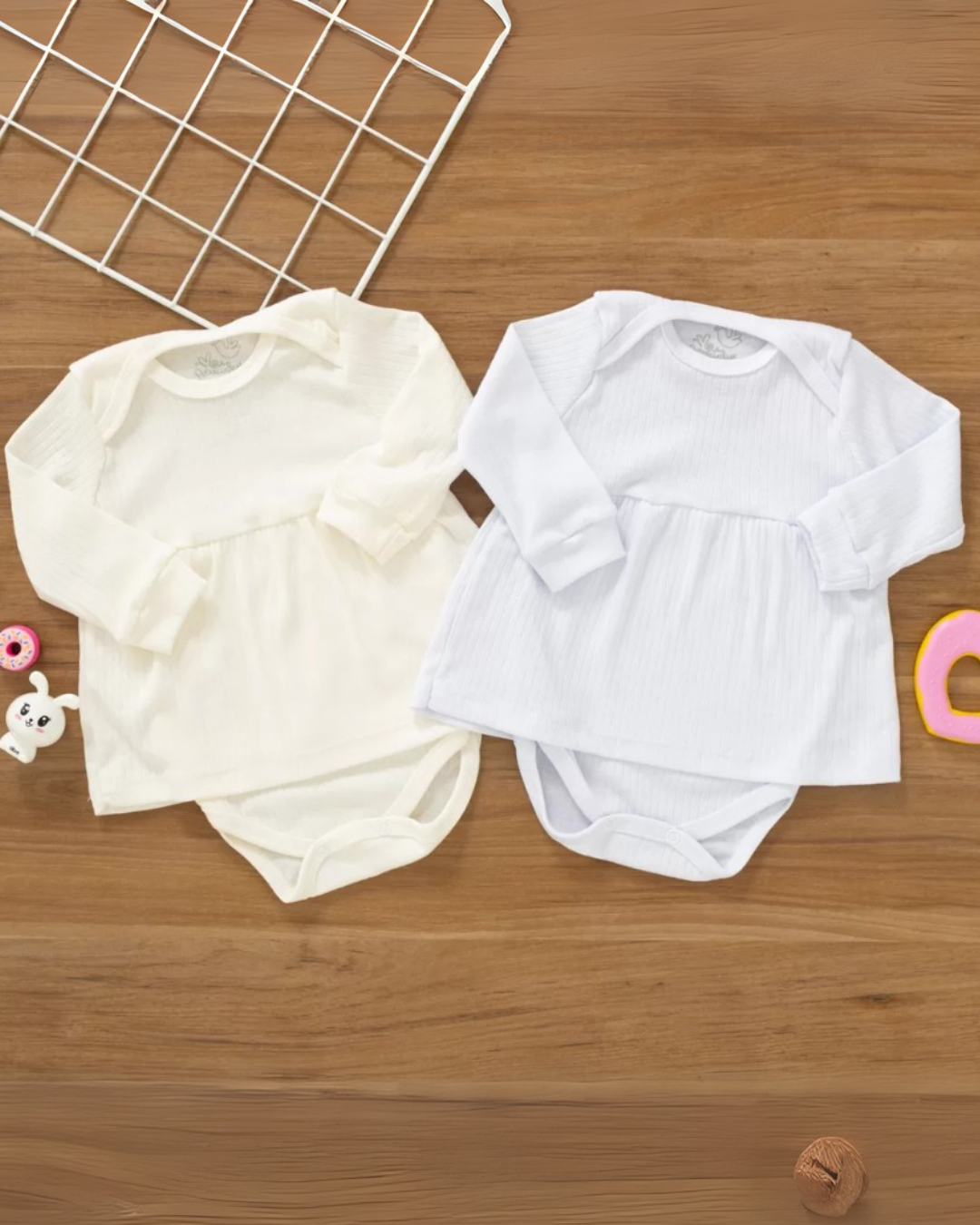 Confeccionado em canelado 100% algodão, nosso vestido é macio e respirável, ideal para a pele sensível dos bebês. O body por baixo proporciona maior segurança e conforto, além de facilitar as trocas de fralda.